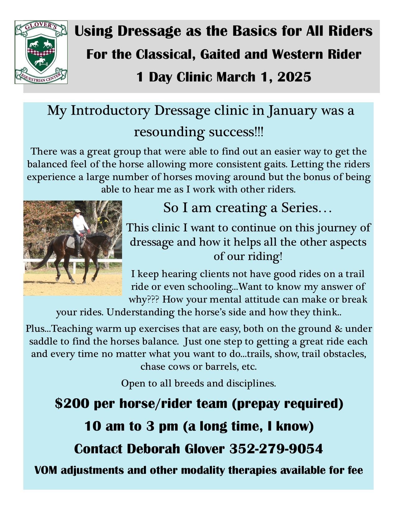 Clinic March 1, 2025 with Deborah Glover on How Dressage Basics Helps with every aspect of riding. See Flyer Below! Contact Deborah Glover 352-279-9054 to Prepay for your spot today!!